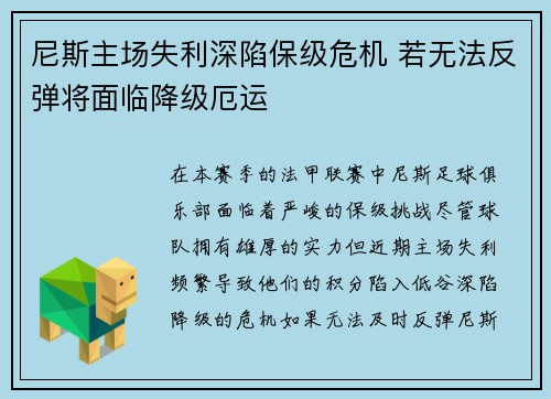 尼斯主场失利深陷保级危机 若无法反弹将面临降级厄运