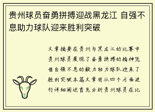 贵州球员奋勇拼搏迎战黑龙江 自强不息助力球队迎来胜利突破